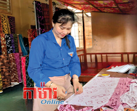 បងស្រី Thạch Thị Rong កាត់ក្រណាត់ត្រៀមឱ្យការកាត់ដេររបស់ខ្លួន។
