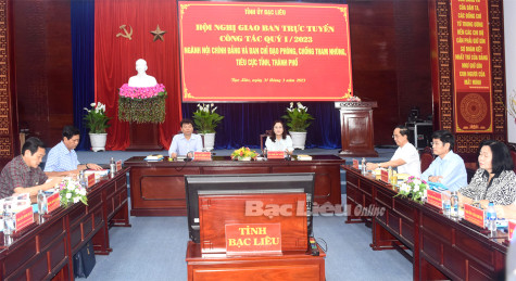 Phó Bí thư Thường trực Tỉnh ủy - Lê Thị Ái Nam và Trưởng Ban Nội chính Tỉnh ủy - Nguyễn Bình Tân đồng chủ trì tại điểm cầu Bạc Liêu, hội nghị giao ban trực tuyến quý 1/2023 ngành Nội chính Đảng và Ban Chỉ đạo Phòng, chống tham nhũng, tiêu cực tỉnh, thành phố do Ban Nội chính Trung ương tổ chức. Ảnh: M.Đ