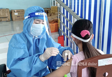 Nữ y sĩ Trung tâm Kiểm soát bệnh tật tỉnh tiêm vắc-xin ngừa COVID-19 cho trẻ em. Ảnh: H.T