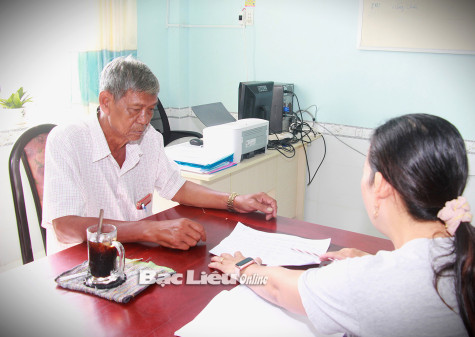 Trưởng ấp Nước Mặn - Thạch Ết trao đổi công việc với cán bộ Ủy ban MTTQ Việt Nam xã Hưng Hội.