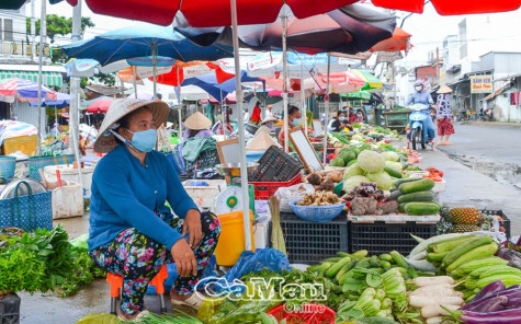 | Chợ nông sản thị trấn Cái Nước bố trí buôn bán giãn cách trong bối cảnh dịch giã hoành hành. |