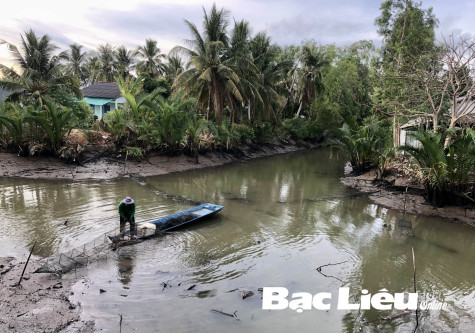 Người đàn ông đặt 4 cái lú bắt thủy sản ngay ngã tư kênh ở xã Hưng Thành (huyện Vĩnh Lợi) - ảnh. Với mật độ lú như thế thì cá tôm nào chạy cho thoát!