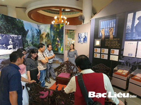 Đoàn văn nghệ sĩ Bạc Liêu tham quan gian trưng bày tập thơ “Nhật ký trong tù” của Bác Hồ. Ảnh: C.T