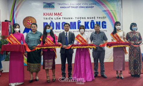 | Đại diện Lãnh sự quán Lào, Lãnh sự quán Campuchia tại TP Hồ Chí Minh, Hội VHNT, Sở GD&ĐT tỉnh Vĩnh Long cắt băng khai mạc Triển lãm Dòng Mê Kông lần thứ 1. |