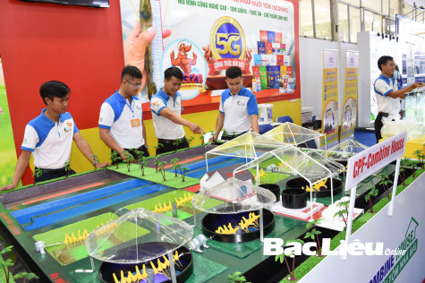 Giới thiệu mô hình nuôi tôm công nghệ cao gắn với liên kết chuỗi giúp nông dân giảm giá thành sản xuất tại Hội chợ ngành tôm năm 2023.