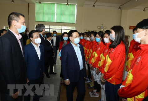 Bí thư Thành ủy Hà Nội - Vương Đình Huệ thăm hỏi, động viên các vận động viên đang luyện tập tại Trung tâm đào tạo vận động viên cấp cao Hà Nội. Ảnh: TTXVN