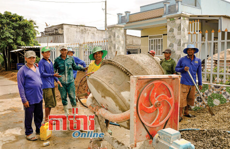 លោក Thái Xam Bô (ឆ្វេង) ចូលរួមប៉ះថ្នល់ជនបទដែលខូចខាត។