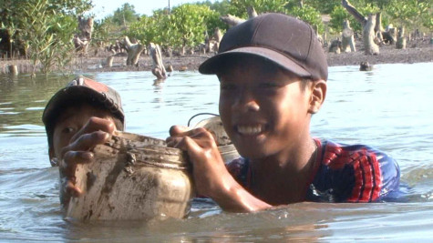 Với đôi chân trần nhỏ bé của mình, các em phải len lỏi vào rừng đước mặc cho rễ cây đâm, hàu cắt vẫn cố gắng bắt từng con ốc, con cua để có tiền phụ giúp cha mẹ trang trải việc học tập.