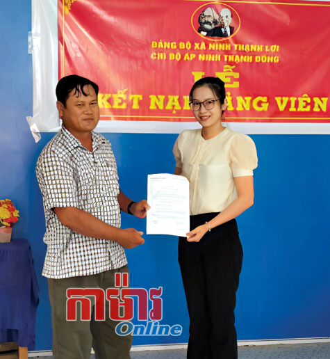លោក Kim Si Tha ប្រគល់សេចក្តីសម្រេចចិត្តចាត់បញ្ចូលសមាជិកបក្សថ្មីនៅអាគារវប្បធម៌ភូមិ។
