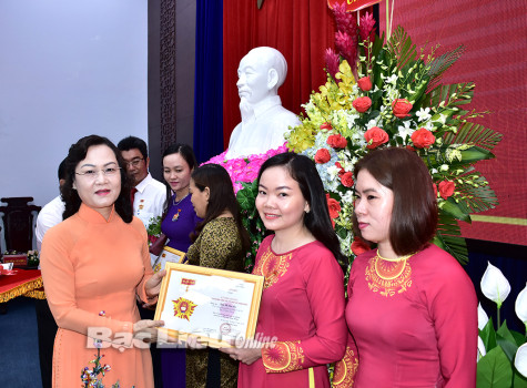 Phó Bí thư Thường trực Tỉnh ủy - Lê Thị Ái Nam tặng kỷ niệm chương “Vì sự nghiệp công tác tổ chức xây dựng Đảng” cho các tập thể, cá nhân tiêu biểu. Ảnh: H.T