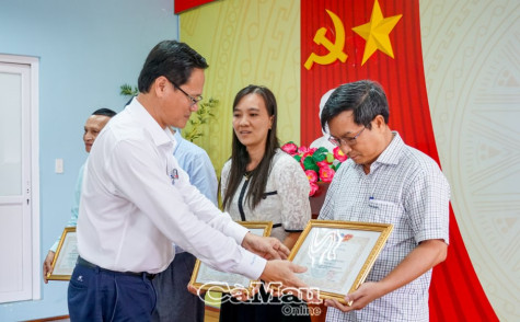 Ông Tạ Đức Hùng, Phó trưởng Phòng GD&ĐT TP Cà Mau, trao giấy khen của Giám đốc BHXH tỉnh tặng các cá nhân.