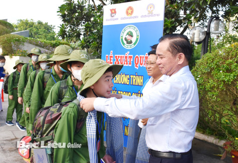 Phó Chủ tịch UBND tỉnh - Phan Thanh Duy trao khăn rằn cho các “chiến sĩ nhí” tại lễ xuất quân.