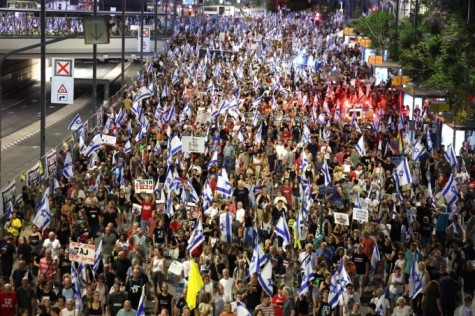 Dòng người biểu tình vẫy cờ Israel và hô vang khẩu hiệu phản đối chính phủ của Thủ tướng Benjamin Netanyahu khi kéo về đại lộ chính ở thủ đô Tel Aviv. Nhiều người còn cầm theo biểu ngữ có dòng chữ “Thủ tướng tội phạm” và “Dừng chiến tranh”.