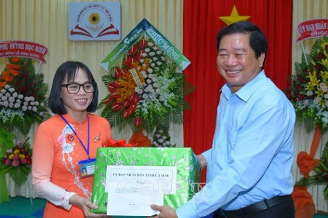 Phó chủ tịch UBND tỉnh Cà Mau Thân Đức Hưởng trao tặng quà cho trường Nuôi dạy trẻ khuyết tật Cà Mau nhân khai giảng năm học mới.