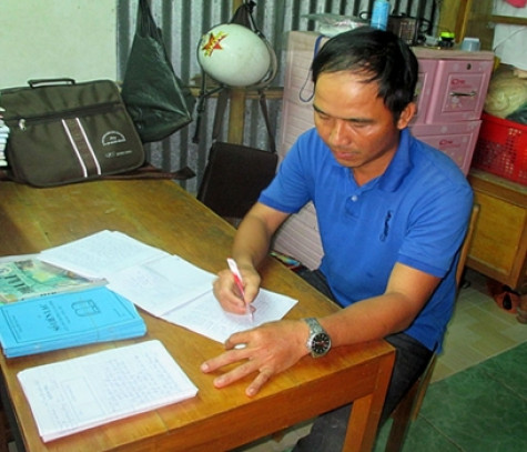 Thầy Huỳnh Thiện Ðắc chấm bài kiểm tra của học sinh. |