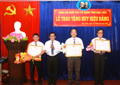 Chiều 22/1, Đảng bộ Khối các cơ quan tỉnh Bạc Liêu tổ chức lễ trao tặng Huy hiệu Đảng cho 19 đồng chí. Theo Quyết định 1318, ngày 23/12/2024 của Ban Thường vụ Tỉnh ủy tặng Huy hiệu Đảng đợt 7/11/2024 và đợt 3/2/2025, Đảng bộ Khối các cơ quan tỉnh có 1 đồng chí được trao Huy hiệu 45 năm tuổi Đảng, 2 đồng chí nhận Huy hiệu 40 năm tuổi Đảng và Huy hiệu 30 năm tuổi Đảng được trao cho 16 đảng viên.