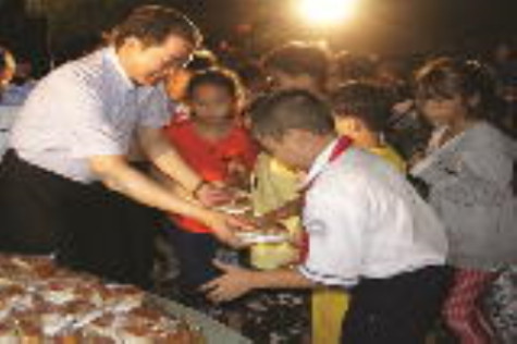 | Phó Chủ tịch UBND tỉnh Cà Mau Thân Ðức Hưởng trao quà cho các em thiếu nhi nhân Hội Trăng rằm. |