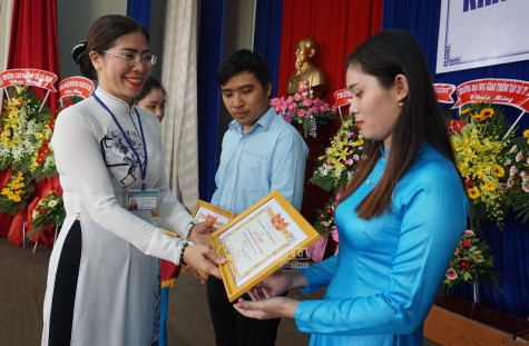 Tiến sĩ Dương Thu Thuỷ, Hiệu trưởng trường Cao đẳng Cộng đồng Cà Mau, trao giấy khen cho các tập thể đạt thành tích tốt trong năm học 2018-2019. |
