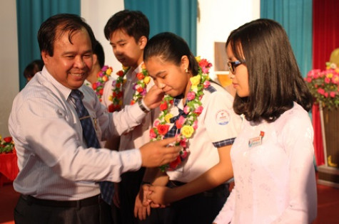 Tiến sĩ Nguyễn Minh Luân, Giám đốc Sở GD&ĐT Cà Mau trao vòng hoa cho các em học sinh đoạt giải tại kỳ thi học sinh giỏi quốc gia THPT năm 2018.