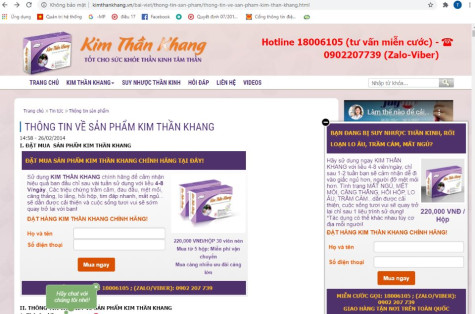 Trên website https://kimthankhang.vn/bai-viet/thong-tin-san-pham/thong-tin-ve-san-pham-kim-than-khang.html có nội dung quảng cáo sản phẩm thực phẩm bảo vệ sức khoẻ Kim Thần Khang không đúng bản chất, lừa dối người tiêu dùng, vi phạm quy định pháp luật về quảng cáo. Sản phẩm này do Công ty TNHH Tư vấn Y dược Quốc tế (địa chỉ: số 9 lô A tổ 100 Hoàng Cầu, phường Ô Chợ Dừa, quận Đống Đa, Hà Nội) công bố và chịu trách nhiệm sản phẩm.