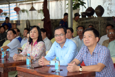 Trưởng Ban Nội chính Tỉnh ủy - Nguyễn Bình Tân, Phó Chủ tịch UBND tỉnh - Ngô Vũ Thăng và lãnh đạo các ban, ngành cùng đông đảo người dân dự lễ khai mạc Giải đua ghe Ngo mini. Ảnh: H.T