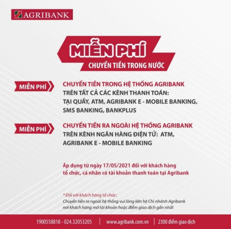 Agribank cũng miễn 100% phí dịch vụ chuyển tiền ra ngoài hệ thống Agribank, áp dụng trên các kênh ngân hàng điện tử: ATM, Agribank E-Mobile Banking.