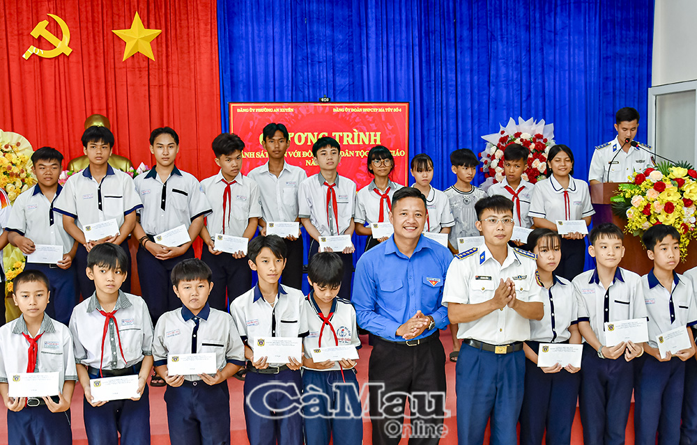 Đại uý Bùi Minh Dũng, Bí thư Đoàn cơ sở Đoàn Đặc nhiệm phòng, chống tội phạm ma tuý số 4 và đồng chí Nguyễn Trần Đăng Khoa, Phó Chủ tịch Uỷ ban MTTQ Việt Nam phường An Xuyên, Bí thư Đoàn phường, trao quà cho học sinh có hoàn cảnh khó khăn.