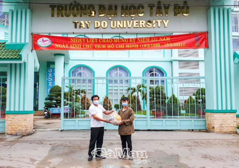 | Ông Bùi Vũ Phương, Phó ban liên lạc Hội đồng hương tặng quà sinh viên Trường Ðại học Tây Ðô gặp khó khăn do dịch Covid-19. Ảnh: DUY KHÔI |