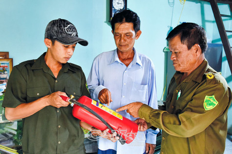 | Ông Mai Tắc Long (bìa phải) tuyên truyền, hướng dẫn bà con tiểu thương trang bị bình chữa cháy. |