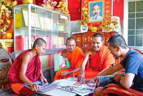 | Các vị sư sãi chùa Rạch Cui, xã Khánh Bình Ðông, huyện Trần Văn Thời chia sẻ thông tin từ ấn phẩm song ngữ Việt - Khmer. (Ảnh chụp ngày 20/11/2009). Ảnh: MỘNG THƯỜNG |