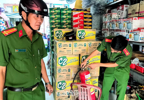 | Công an Ðầm Dơi kiểm tra công tác PCCC tại các hộ kinh doanh. |
