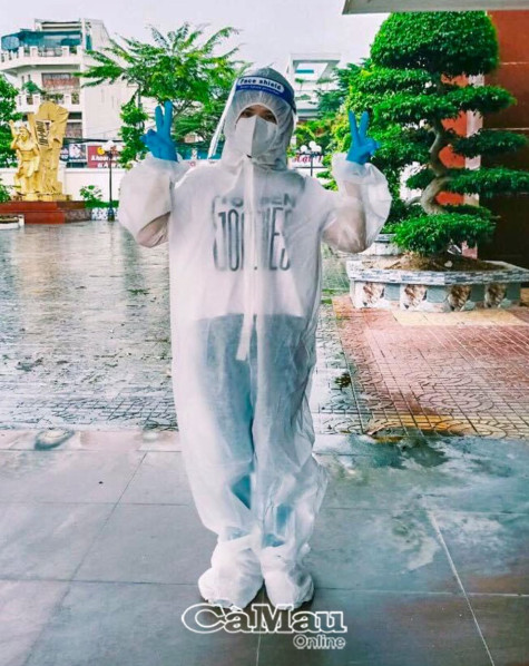 | Dù trong trang phục bảo hộ nóng bức và đối mặt với bao nhiêu khó khăn, nguy hiểm, Thượng uý Nguyễn Phương Thảo vẫn thể hiện tinh thần lạc quan, vui vẻ. (Nguồn: Facebook của Phương Thảo). |