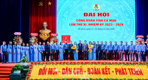 Uỷ viên BCH Trung ương Đảng, Chủ tịch Tổng LĐLĐ Việt Nam Nguyễn Đình Khang và Uỷ viên BCH Trung ương Đảng, Bí thư Tỉnh uỷ, Chủ tịch HĐND tỉnh Nguyễn Tiến Hải tặng hoa chúc mừng BCH LĐLĐ tỉnh Cà Mau khoá XI, nhiệm kỳ 2023-2028.