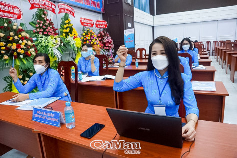 | Đại biểu tại điểm cầu chính biểu quyết thông qua danh sách Ban Chấp hành Hội LHPN tỉnh Cà Mau khoá XII, nhiệm kỳ 2021-2026. |