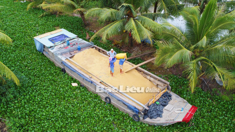 Thương lái thu mua lúa trong dân ở xã Minh Diệu (huyện Hòa Bình). Ảnh: C.L