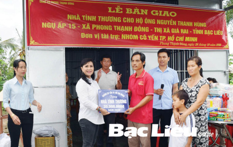 Mạnh thường quân trao bảng tượng trưng tặng nhà tình thương cho hộ nghèo xã Phong Thạnh Đông (TX. Giá Rai) năm 2020. Ảnh: T.Q