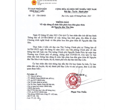 Trước đó, Thường trực Tỉnh ủy nhận được Công văn 33-CV/BCS, ngày 1/2/2021 của Ban cán sự đảng UBND tỉnh “về việc xin ý kiến thời gian, địa điểm bắn pháo hoa đón Giao thừa tết Nguyên đán Tân Sửu 2021”.