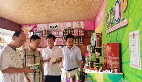 Đoàn tham quan điểm trưng bày bán các sản phẩm OCOP tỉnh Đồng Tháp.