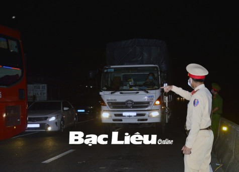 Các lực lượng làm nhiệm vụ xuyên đêm tại chốt chặn kiểm soát dịch bệnh COVID-19 trên địa bàn huyện Vĩnh Lợi. Ảnh: C.K