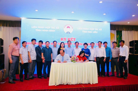 Sau đó, các đại biểu đã chứng kiến lễ ký kết Chương trình hợp tác phát triển kinh tế tập thể giữa Liên minh HTX tỉnh Bạc Liêu và Liên minh HTX tỉnh Ninh Bình (ảnh).