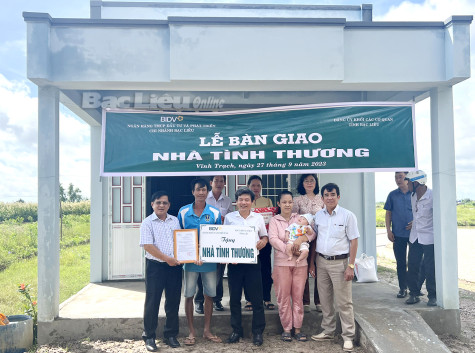 Bí thư Đảng ủy Khối các cơ quan tỉnh - Lê Hữu Buôl trao quyết định bàn giao nhà tình thương cho hộ nghèo xã Vĩnh Trạch (TP. Bạc Liêu). Ảnh: H.T