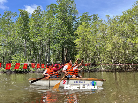 Du khách trải nghiệm chèo thuyền tham quan rừng phòng hộ tại Khu du lịch Điện gió Hòa Bình.