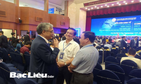 Ông Huỳnh Chí Nguyện - Phó Chủ tịch UBND tỉnh (đứng giữa) trao đổi với các diễn giả tham dự Diễn đàn về tăng trưởng xanh ở Bạc Liêu.