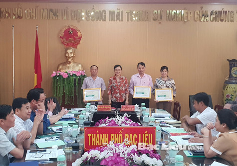 Bà Đỗ Ái Lam - Phó Chủ tịch UBND TP. Bạc Liêu trao giấy khen cho các tập và cá nhân có thành tích trong năm 2023.