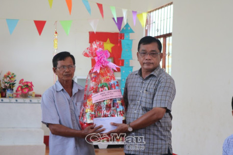 | Trưởng Ban Dân tộc tỉnh Cà Mau Triệu Quang Lợi tặng quà cho đại diện salatel xã Trần Phán (huyện Đầm Dơi) |