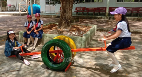 Các em học sinh vui mừng khi có sân chơi trong năm học mới. |