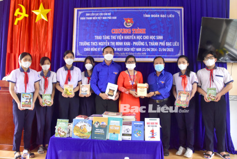 Sáng 20/4, Tỉnh đoàn Bạc Liêu phối hợp với Ban liên lạc Cựu cán bộ Đoàn Thanh niên Việt Nam phía Nam tổ chức chương trình trao tặng thư viện khuyến học cho 2 đơn vị trường học tại TP. Bạc Liêu: THCS Nguyễn Thị Minh Khai (Phường 5) và THCS Võ Nguyên Giáp (xã Vĩnh Trạch). Theo đó, tại mỗi nơi, đoàn đã trao tặng 1 thư viện khuyến học với hơn 500 đầu sách viết về tuổi trẻ, hướng nghiệp, khoa học - kỹ thuật, nông nghiệp - nông thôn - nông dân, kỹ thuật số, giáo dục truyền thống, giải trí lành mạnh…