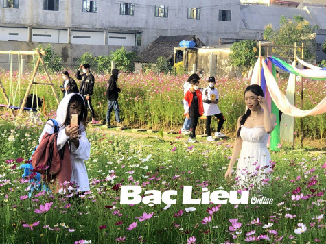 Các bạn trẻ check-in tại cánh đồng hoa Huỳnh (huyện Vĩnh Lợi). Ảnh: H.T