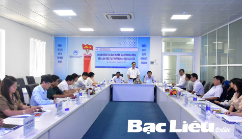(BL-ĐKC) Sáng 15/5, Đoàn công tác Ban Tuyên giáo Trung ương do đồng chí Đoàn Văn Báu - Vụ trưởng Vụ Lý luận chính trị (LLCT) làm trưởng đoàn đã đến khảo sát kết quả thực hiện Kết luận 94 năm 2014 của Ban Bí thư về tiếp tục đổi mới việc học tập LLCT trong hệ thống giáo dục quốc dân (giai đoạn 2014 - 2024) tại Trường đại học Bạc Liêu - (ảnh).