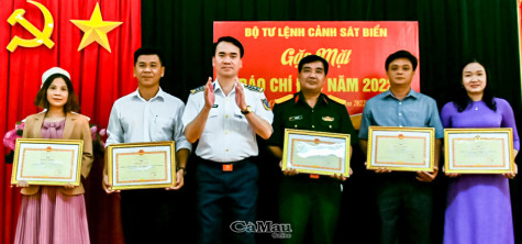 | Tại buổi gặp mặt báo chí, Bộ Tư lệnh Cảnh sát biển Việt Nam tặng Bằng khen cho Ban Biên tập Báo Cà Mau và các tập thể có thành tích tuyên truyền về xây dựng hình ảnh người chiến sĩ cảnh sát biển trong tình hình mới. Ảnh: Nhà báo Lê Phong Phú (thứ 2 từ phải sang), phóng viên báo Cà Mau, đại diện nhận Bằng khen. |